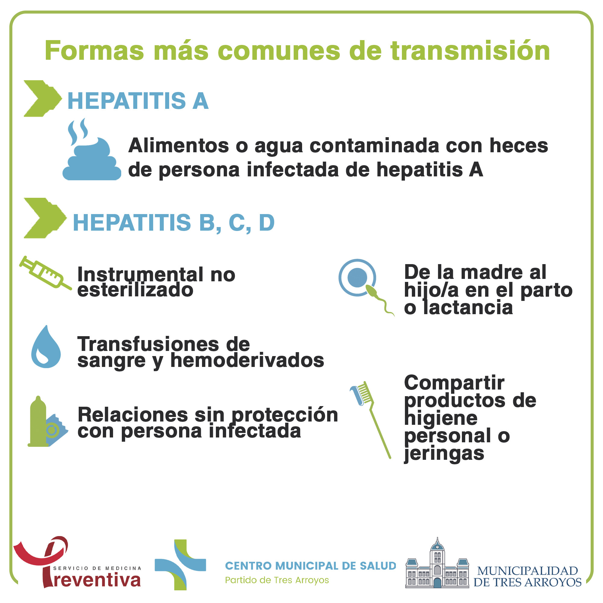Las hepatitis B y C se transmiten por vía de relaciones sexuales sin preservativo, transfusión de sangre infectada, uso de drogas inyectables, compartir cepillo de dientes y/o máquinas de afeitar y la trasmisión de madre a hijo.