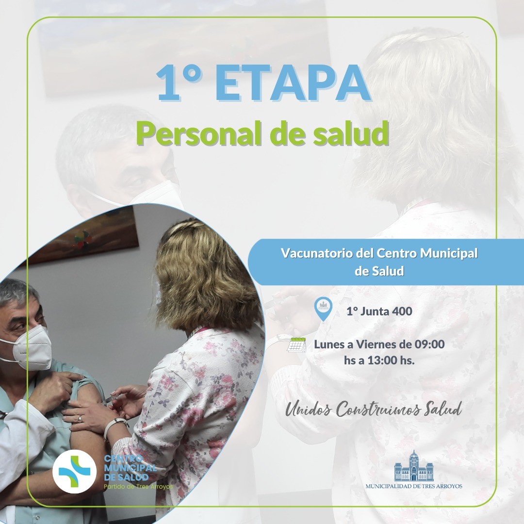 1era etapa: personal de salud, que se está llevando adelante únicamente en el vacunatorio del Centro Municipal de Salud de lunes a viernes de 9 a 13 horas.