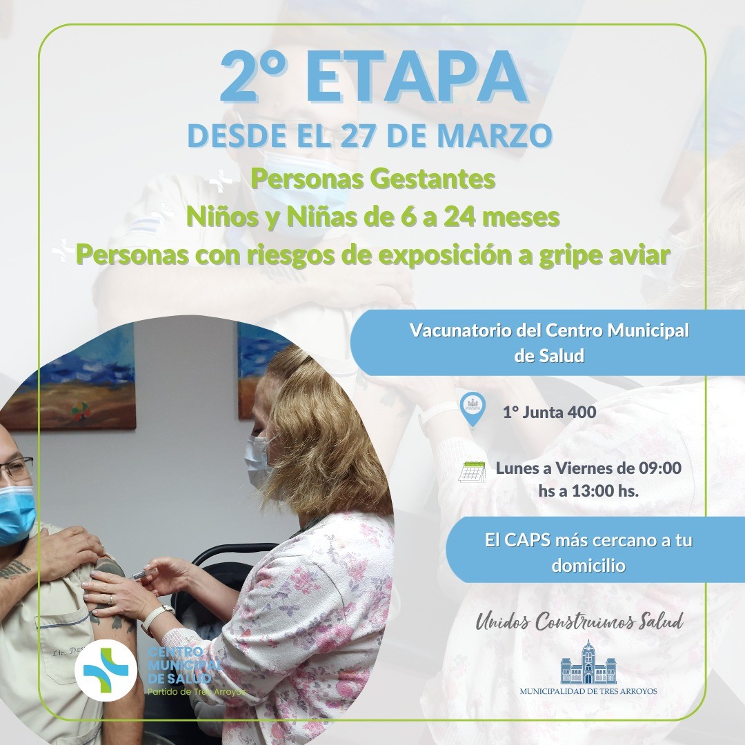 En una 2da etapa, a partir del 27 de marzo: se comienzan a vacunar personas gestantes y puérperas, niñas y niños de 6 a 24 meses, personas con riesgo de exposición a gripe aviar, es decir que trabajen en contacto con aves.