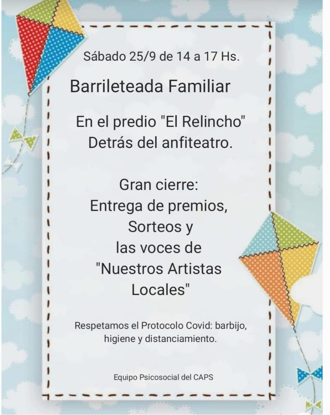 El equipo interdisciplinario de nuestro Centro de Salud de Reta, invitan a la comunidad y a los turistas a celebrar y compartir la llegada de la primavera con una barrileteada familiar que se realizará el sábado 25 de setiembre de 14 a 17 horas en el predio “El Relincho” ubicado detrás del anfiteatro.