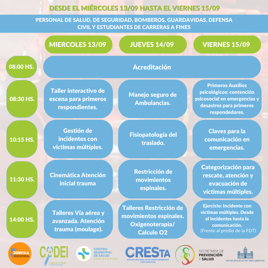 En el marco de un trabajo coordinado con Dirección Nacional de Emergencias Sanitarias (DINESA) dependiente del Ministerio de Salud de la Nación, se realizara en Tres Arroyos un Programa de capacitación en forma de Jornadas Conjuntas, en formato presencial.
