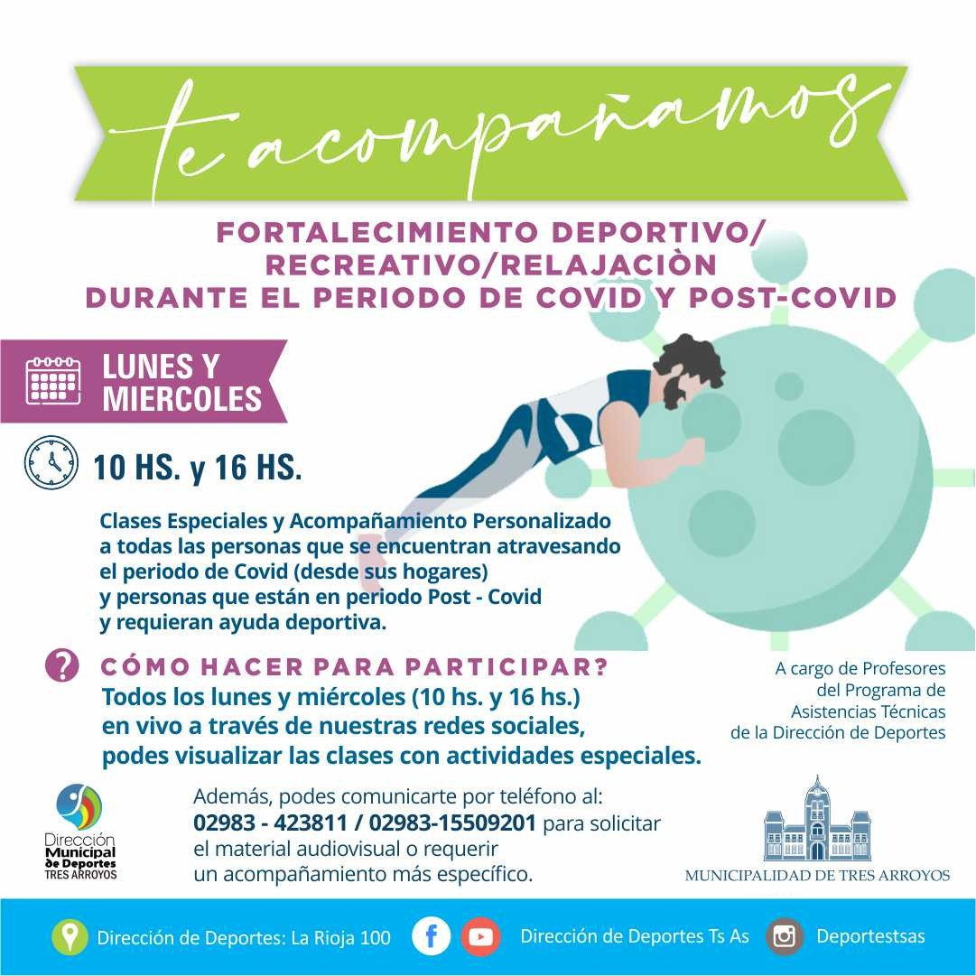 La Dirección de Deportes a través de la Municipalidad de Tres Arroyos presento el proyecto "TE ACOMPAÑAMOS" para todas las personas que están atravesando el Covid en sus hogares o aquellas personas que están en el proceso Post - Covid.-