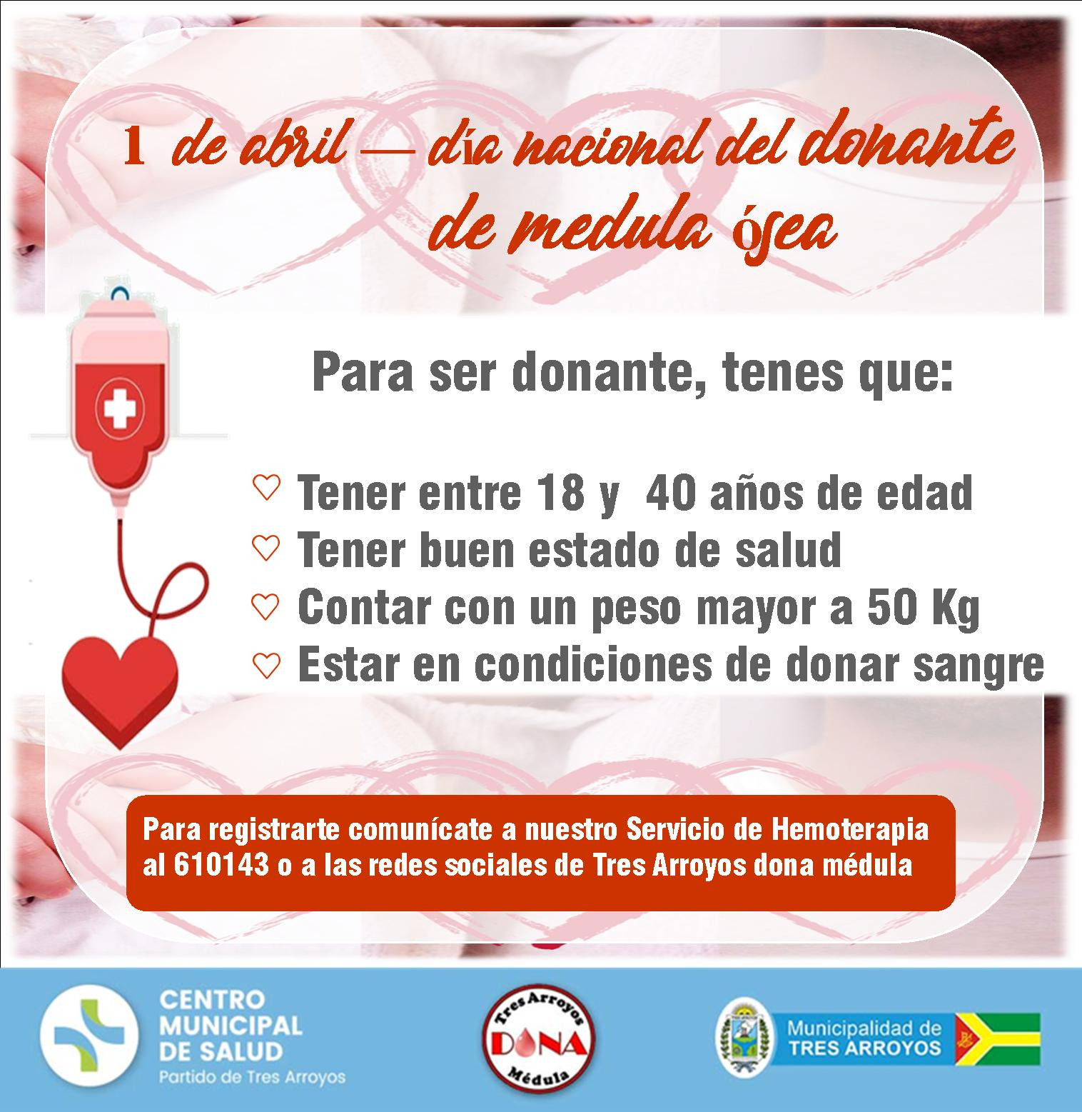 Invitamos a la comunidad a donar sangre voluntariamente en forma espontanea de lunes a viernes de 8 a 11 hs y de esta manera luego de la segunda donación de sangre, quienes deseen podrán inscribirse como futuros donantes de medula ósea. Para más información llamar al 2983-610143 o a las redes sociales de Tres Arroyos dona medula.