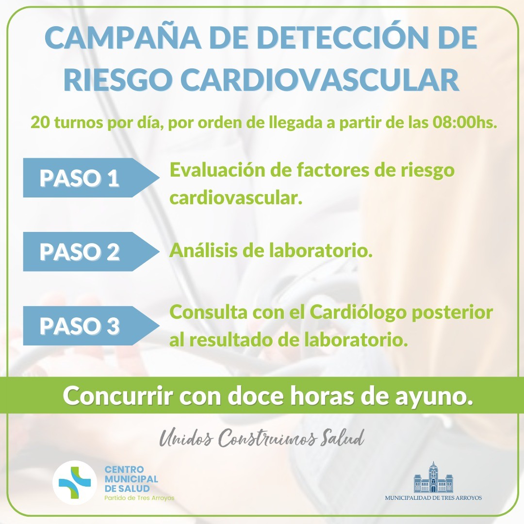 En este sentido, tomar medidas de manera inmediata resulta fundamental, por lo que el Centro Municipal de Salud realiza una campaña de detección de riesgo cardiovascular dirigida a personas mayores de 18 años, que no padezcan enfermedad cardiovascular conocida y que no estén bajo tratamiento y/o atención cardiológica.