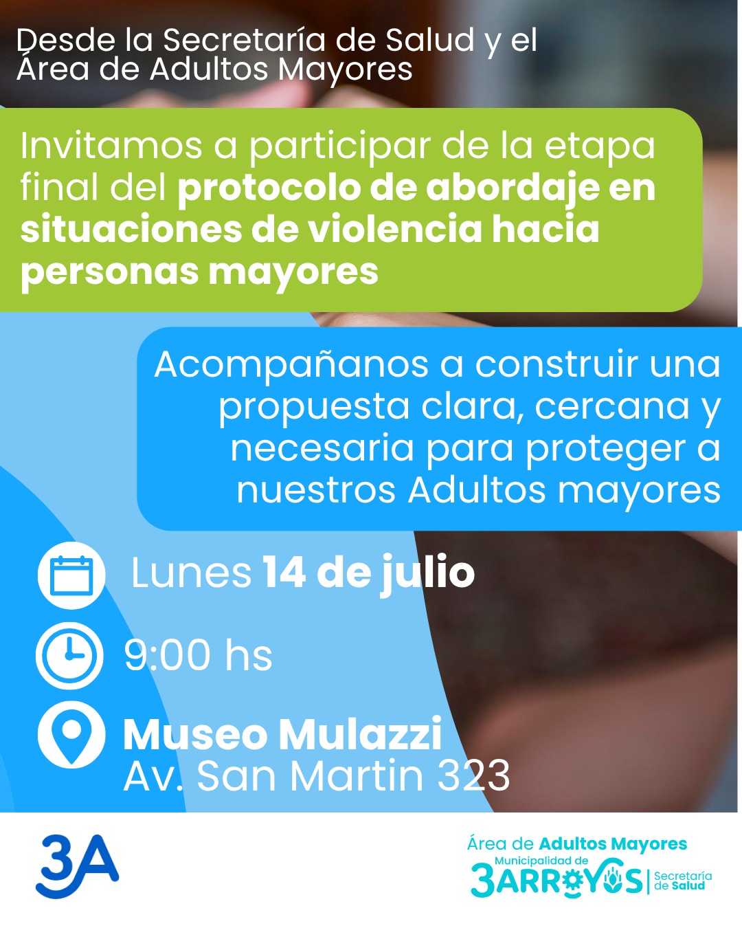 ¡Te invitamos a la etapa final del Protocolo de Abordaje en situaciones de violencia hacia Personas Mayores! Fecha: Lunes 14 de julio Hora: 9hs Lugar: Museo Mulazzi, Av. San Martin 323